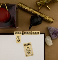 Four (4) mini brass page markers for your journal, planner or book created by Creeping Moon. Art by Megan Wyreweden,