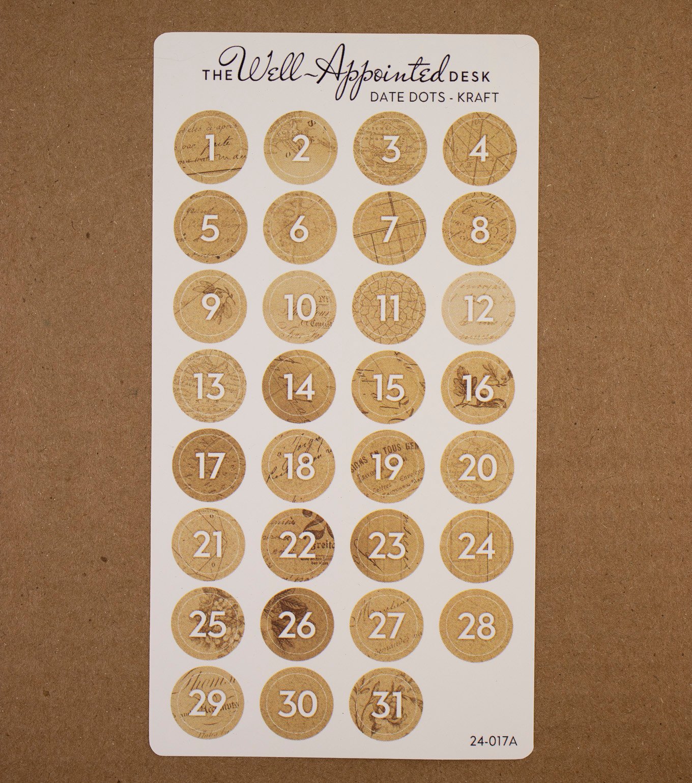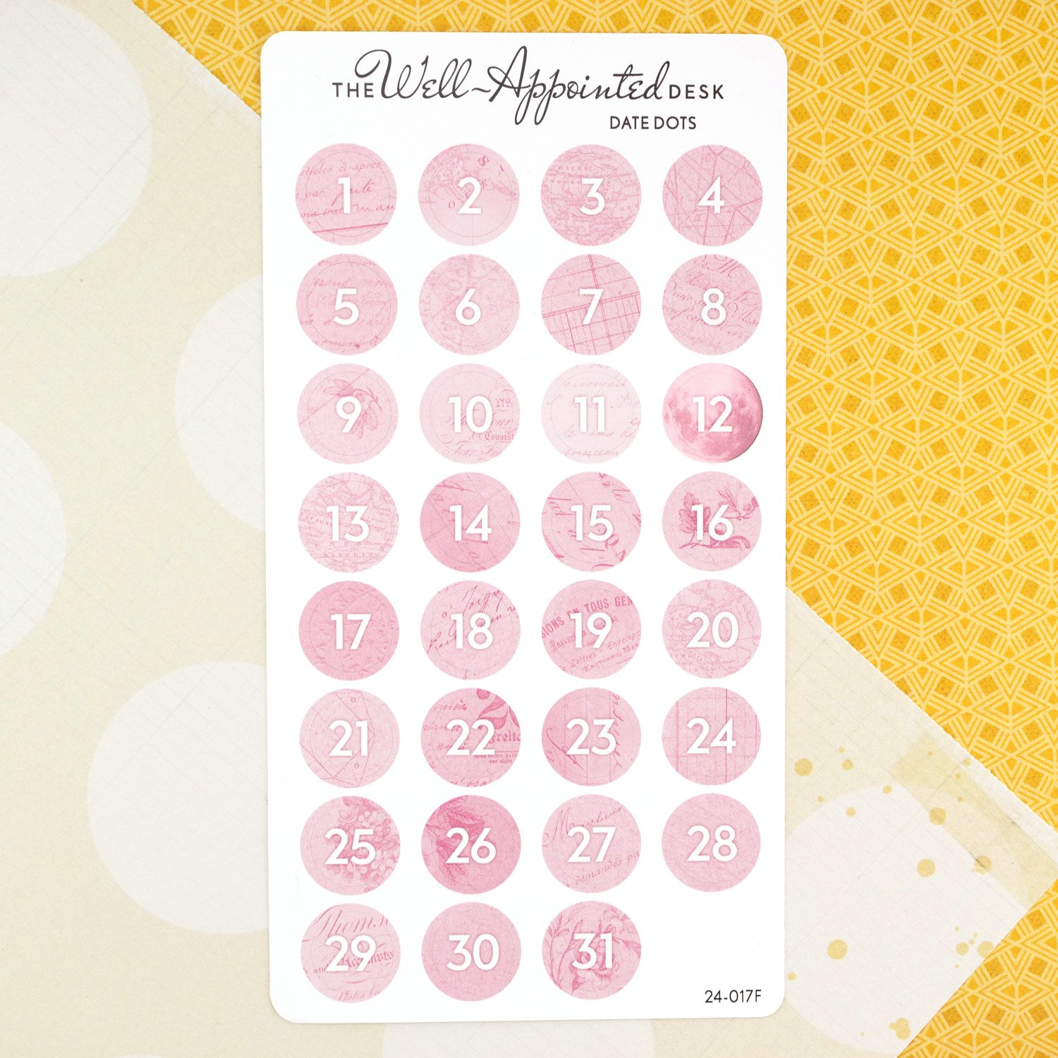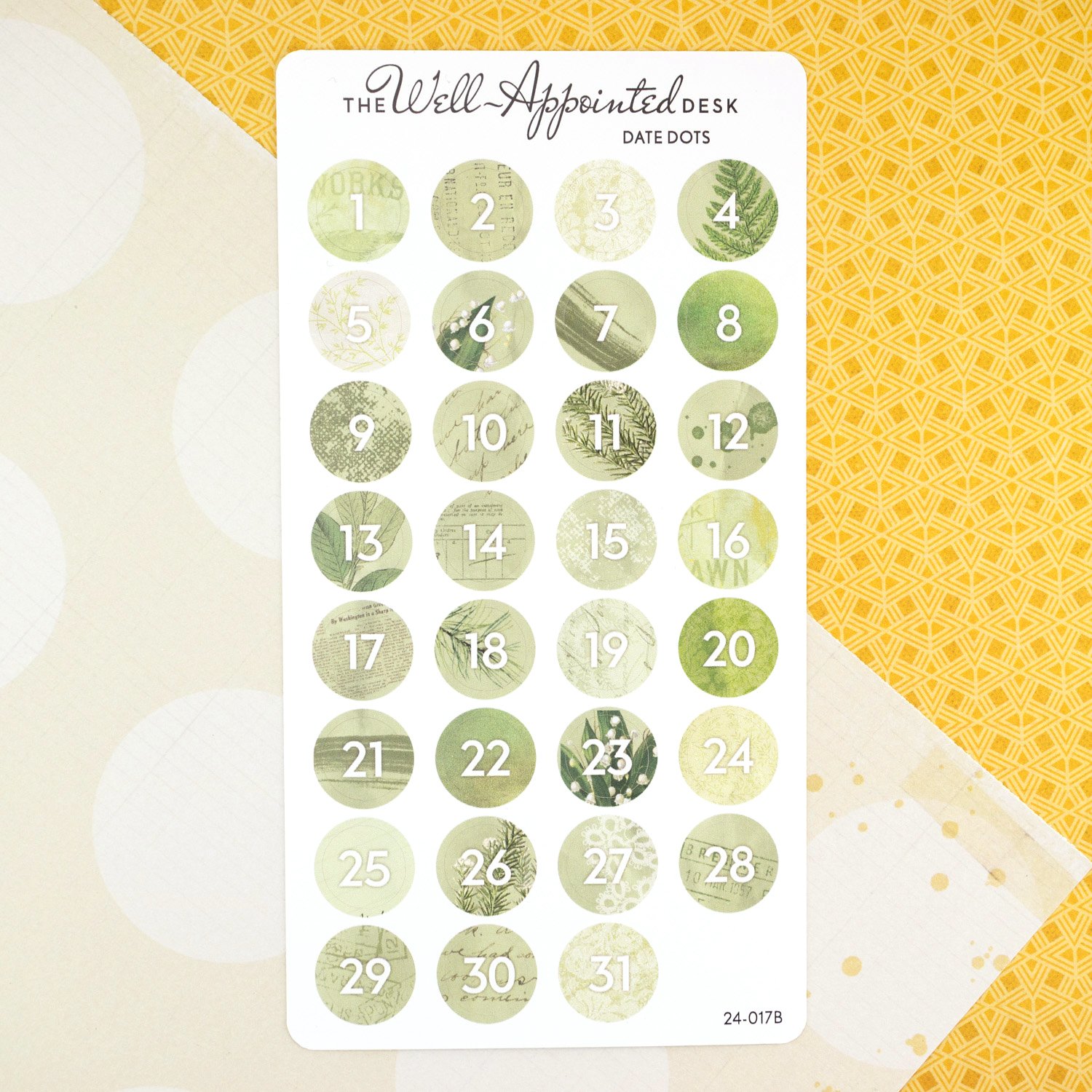 Original vintage-inspired stickers by The Well-Appointed Desk. Perfect for journals, planners, memory keeping and more. 31 round stickers per sheet, one for each day of the month.