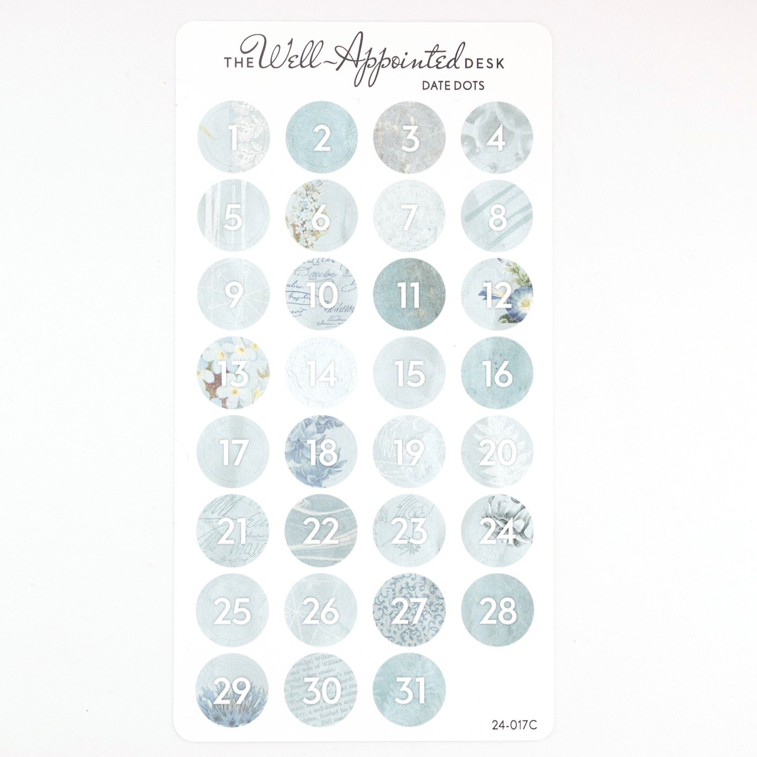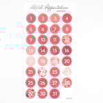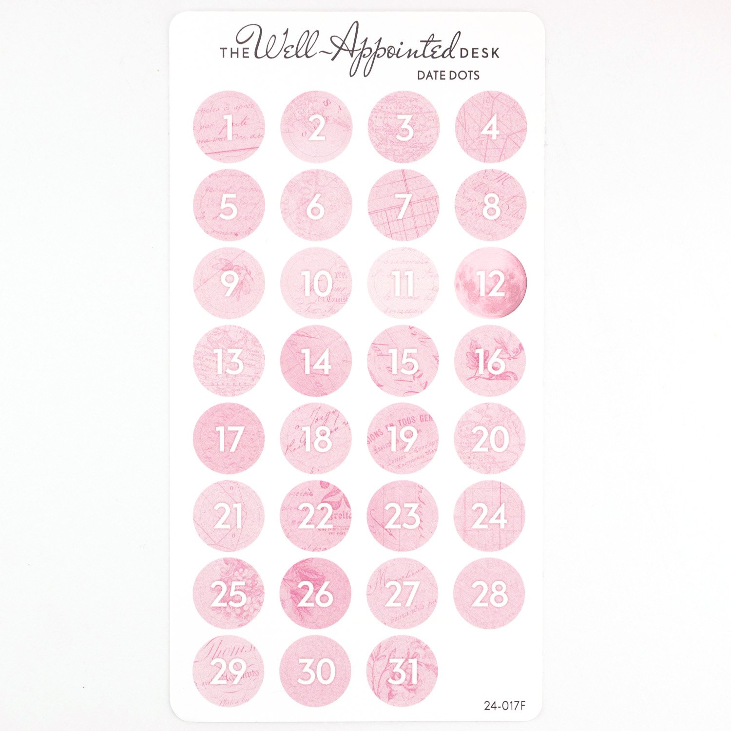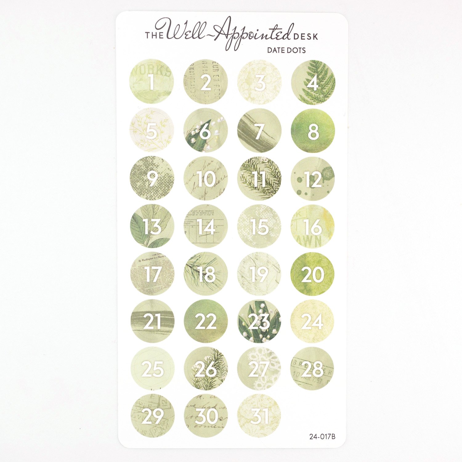 Original vintage-inspired stickers by The Well-Appointed Desk. Perfect for journals, planners, memory keeping and more. 31 round stickers per sheet, one for each day of the month.