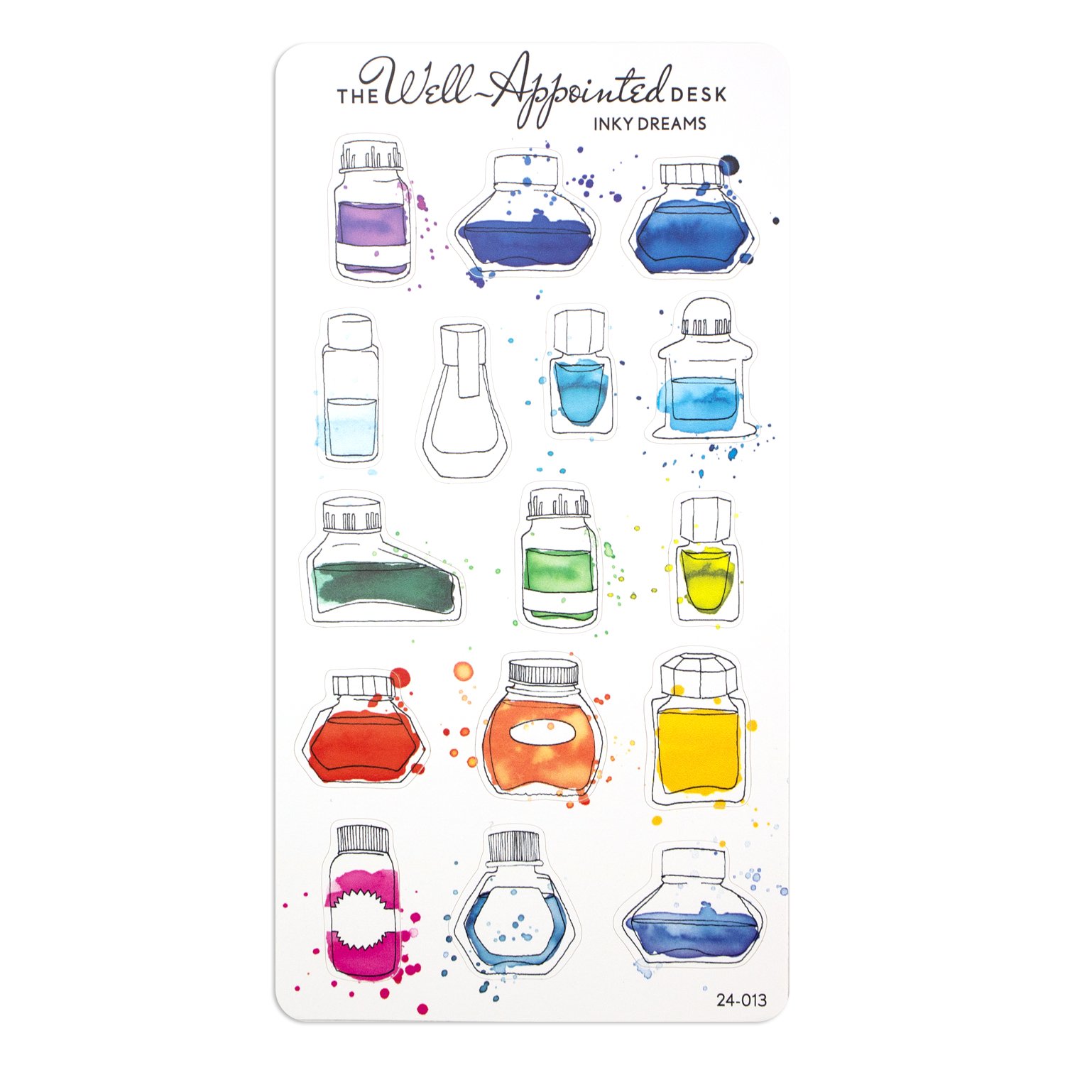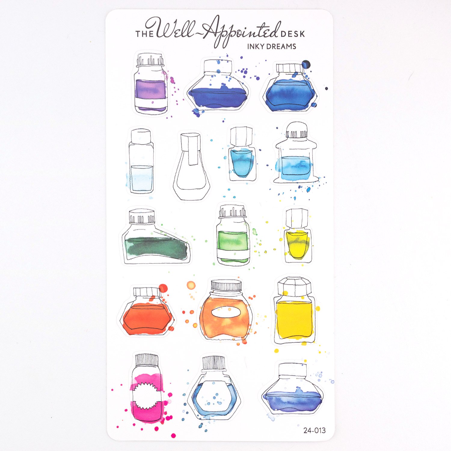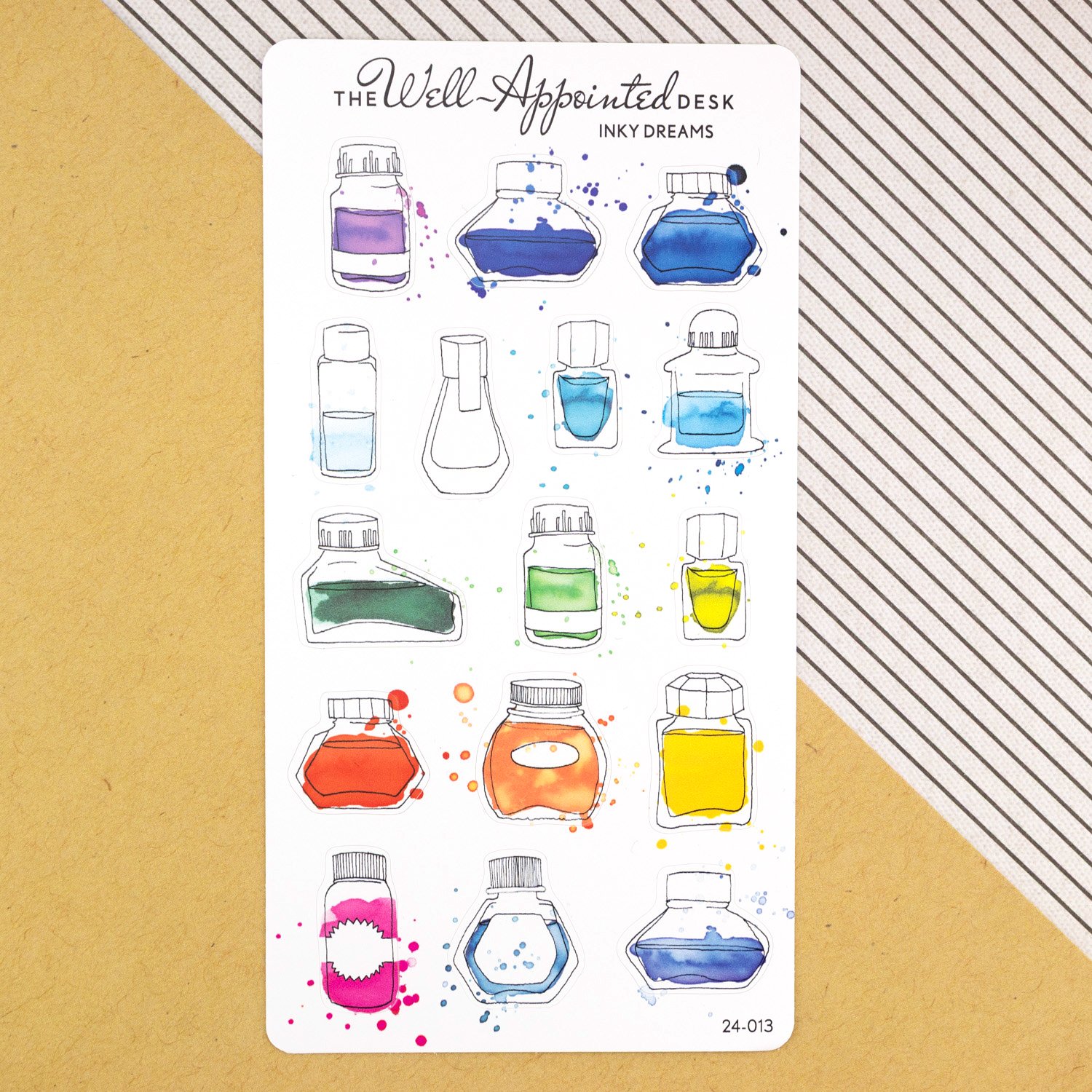Inky splatters over line drawings of ink bottles from my personal collection.