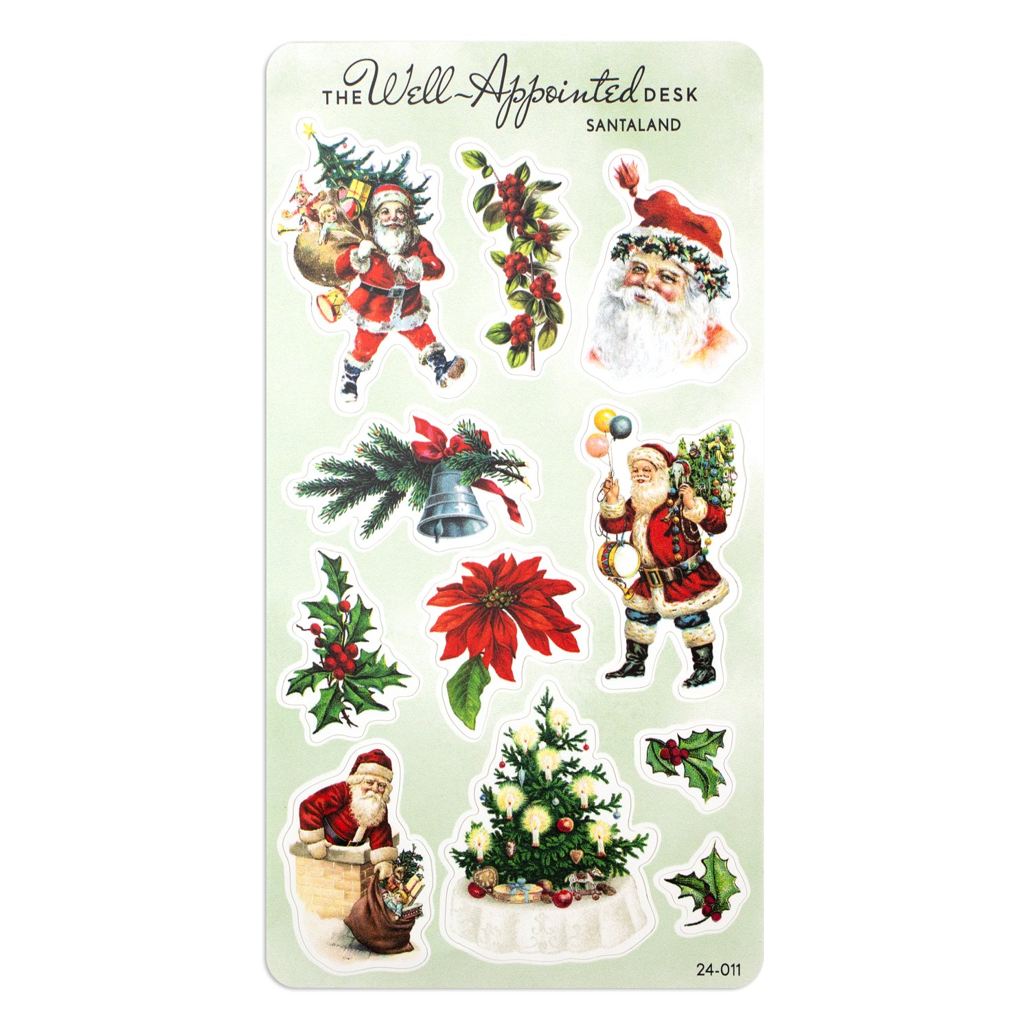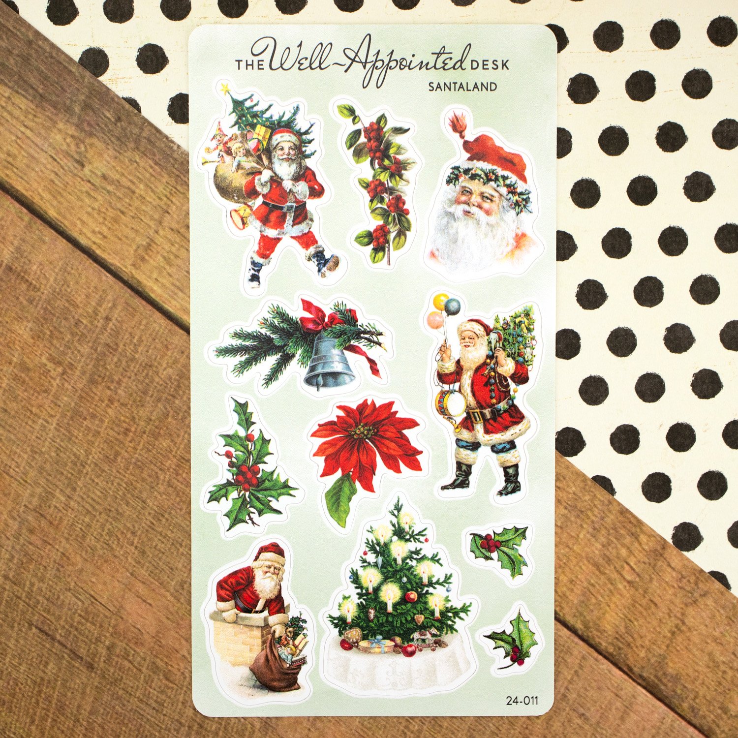 Original vintage-inspired stickers from The Well-Appointed Desk. Classic vintage Santa, holly and greenery illustrations perfect for the holiday season. Each sticker is kiss cut for easy removal to add to journals, planners, memory keeping and more. Over 10 stickers per sheet.