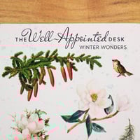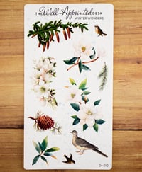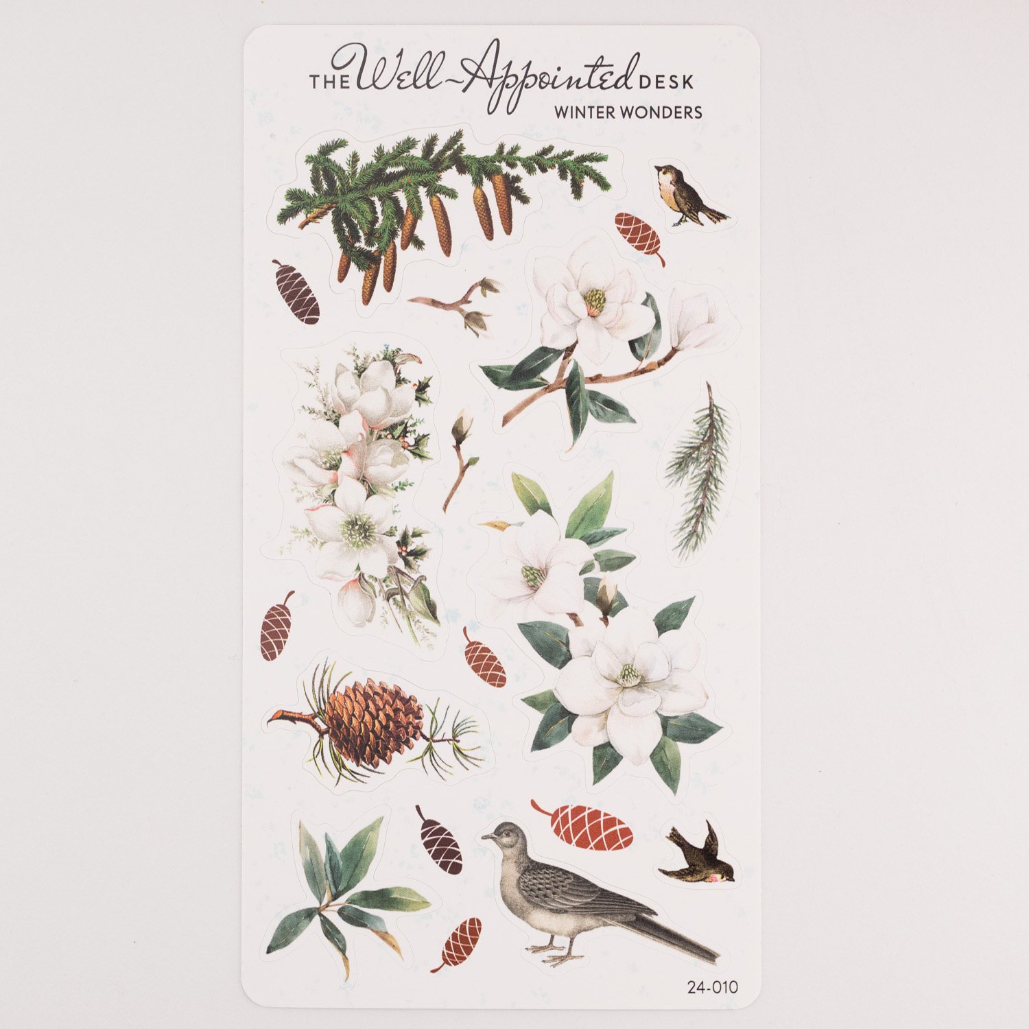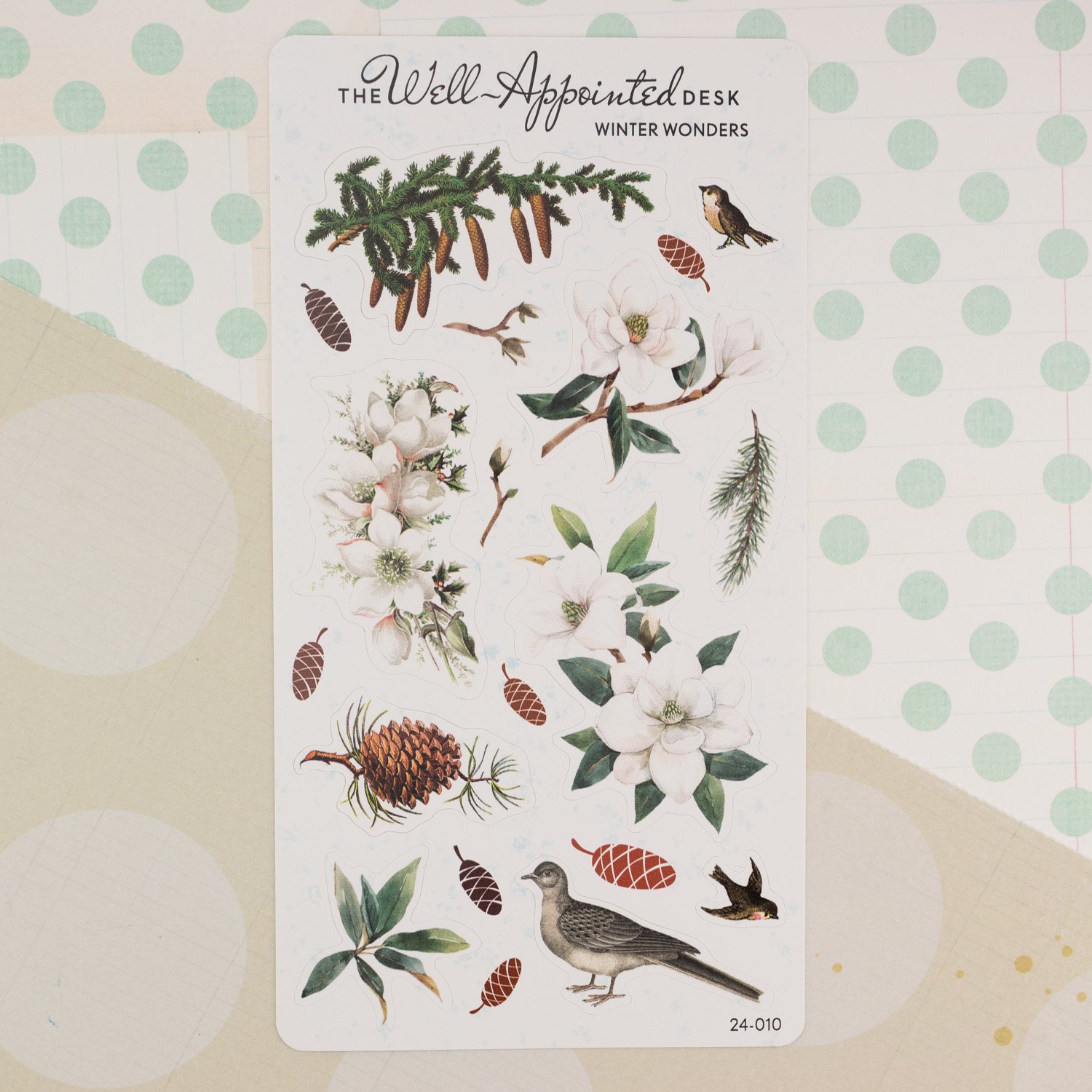 Original vintage-inspired stickers from The Well-Appointed Desk. Wintery whites, evergreens and bird illustrations to capture the beauty of the winter season. Each sticker is kiss cut for easy removal to add to journals, planners, memory keeping and more. 10 stickers per sheet.